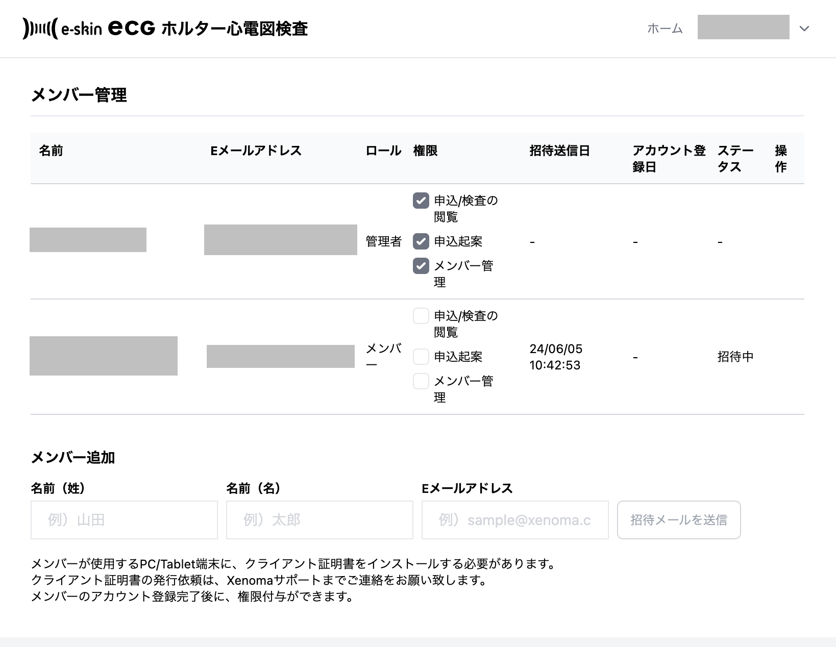 - 注意 メンバーに、初期状態では、「申込/検査の閲覧」権限のみが付与されています。