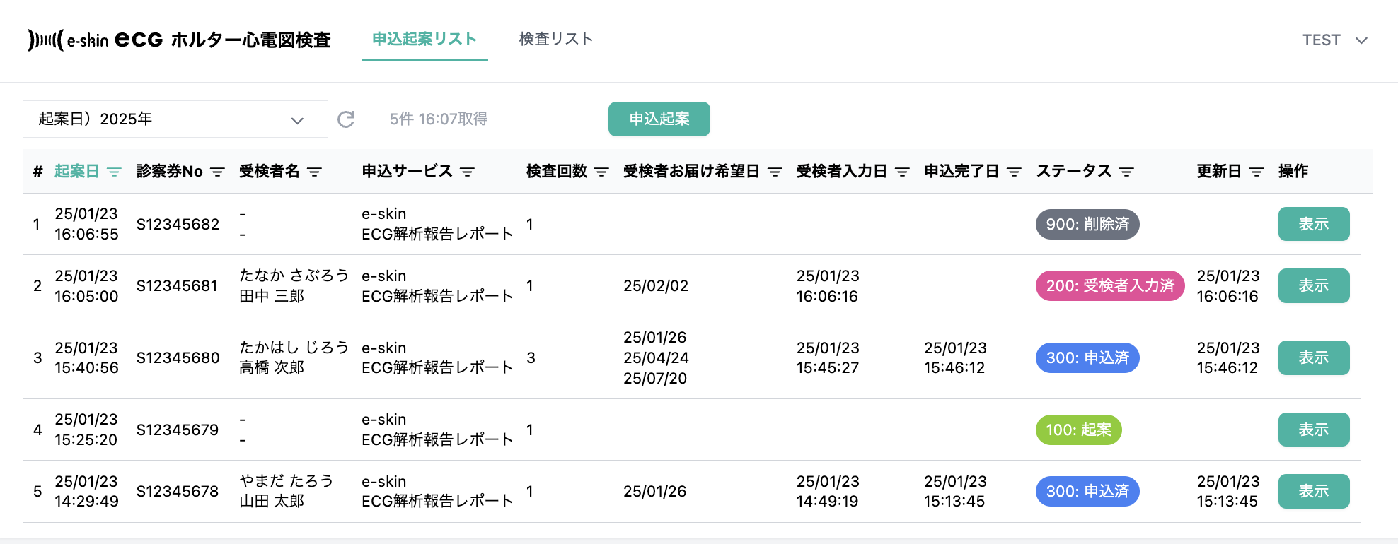 - 申込起案、受験者入力、申込送信済みのステータスを表示